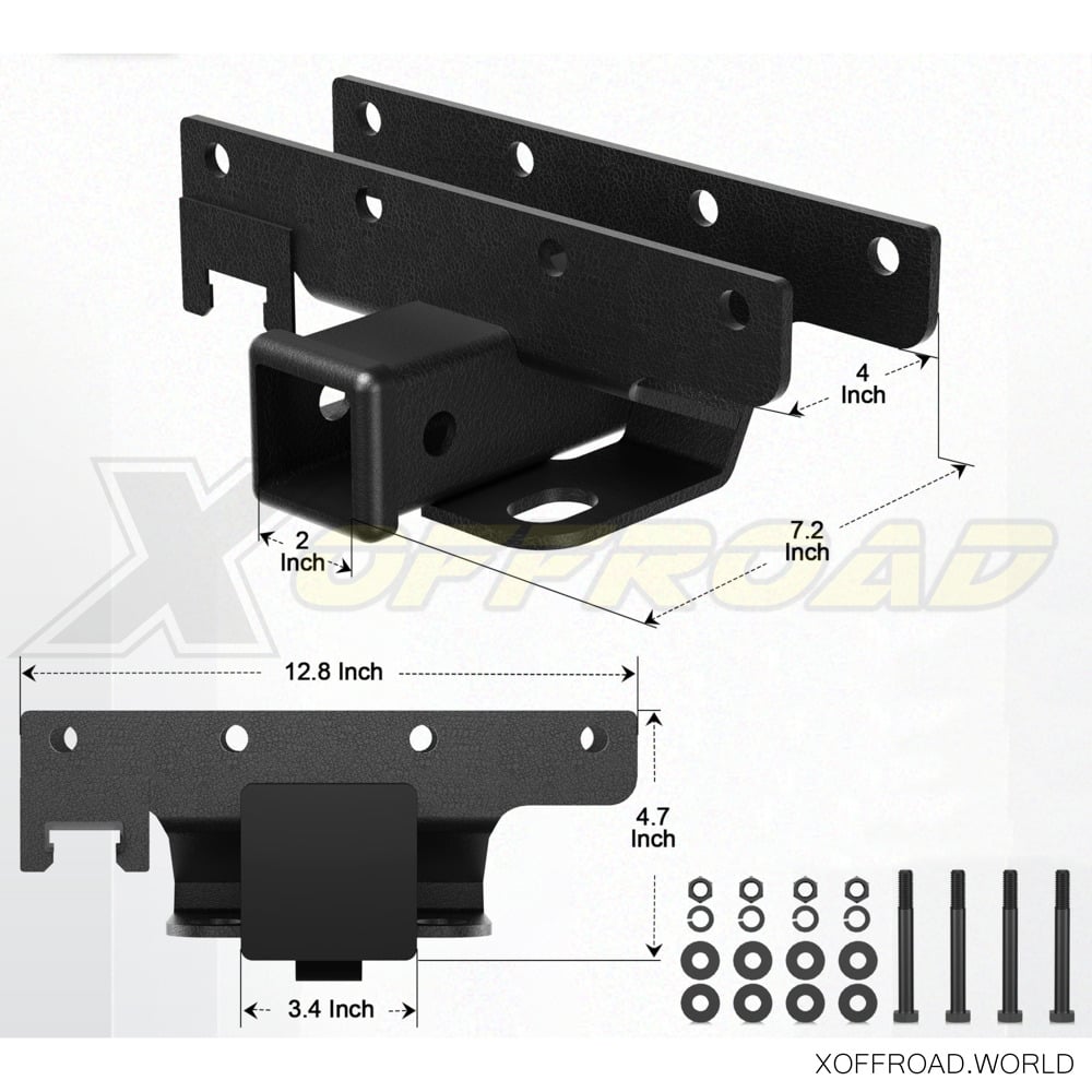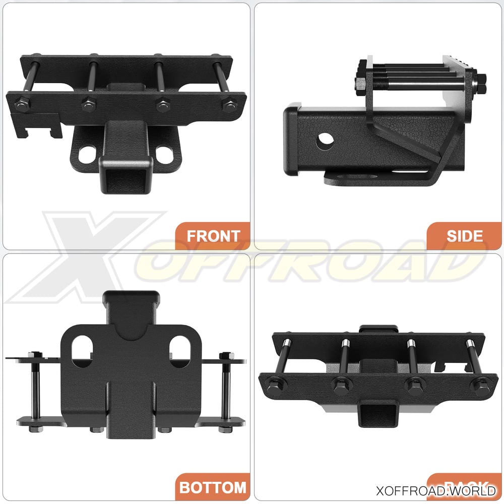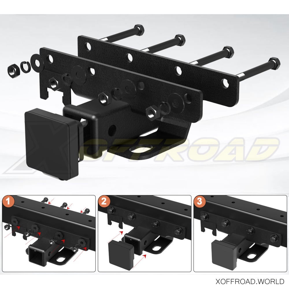 L'installation simple par boulonnage prend quelques minutes à installer sans modification du véhicule. Consultez votre manuel du propriétaire pour connaître la capacité de remorquage maximale du véhicule et les procédures de remorquage recommandées. Le récepteur x-offroad assure la connexion aux accessoires de base tels que les porte-vélos, les porte-récepteurs, les crochets de récupération, le treuillage, etc. Le faisceau de câbles et la balle doivent être achetés séparément.